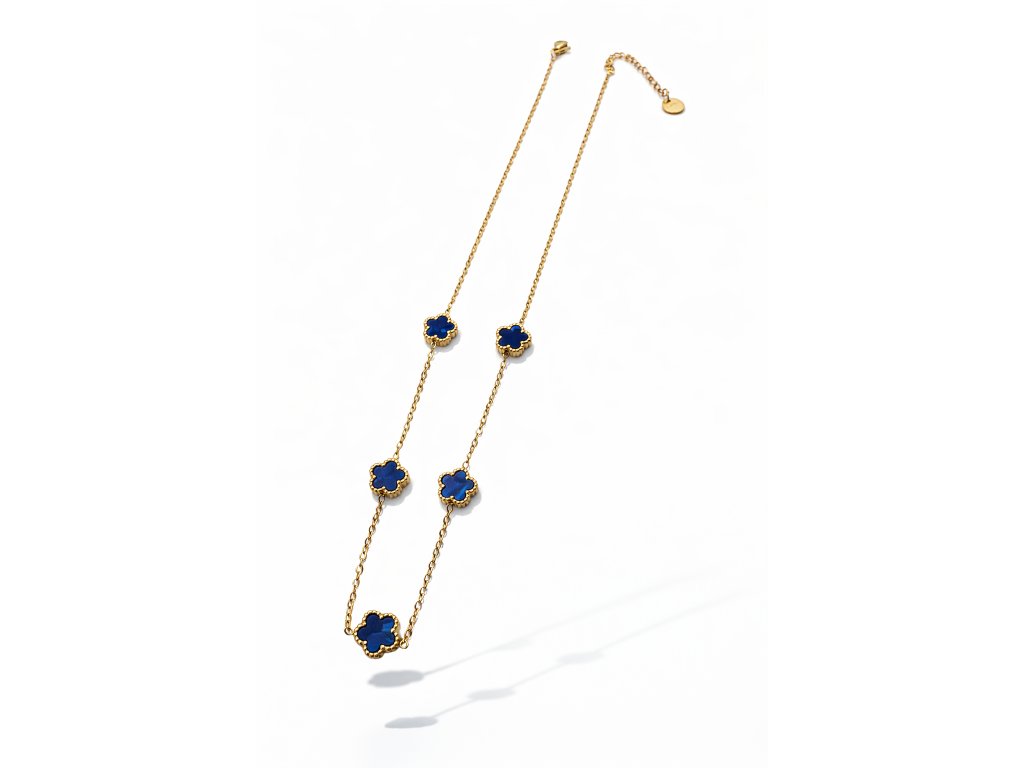 Dámský náhrdelník s pěti květinovými motivy v syté modré barvě působí elegantně, luxusně a moderně. Kontrast modrých květů a zlatého řetízku dodává šperku výrazný, ale stále velmi ženský charakter.