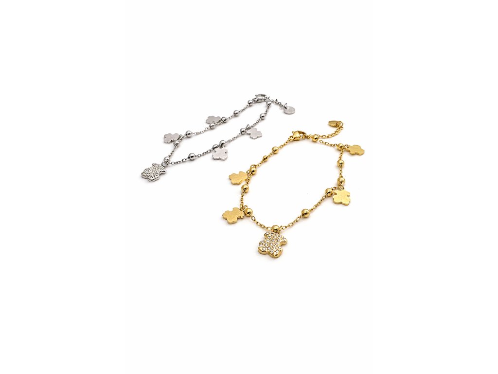 Tento dámský náramek s motivem medvídka působí jemně, hravě a zároveň elegantně. Dominantní přívěsek medvídka zdobený drobnými kamínky dodává šperku luxusní vzhled, zatímco menší dekorativní motivy rozmístěné po řetízku vytvářejí vyvážený a harmonický design.