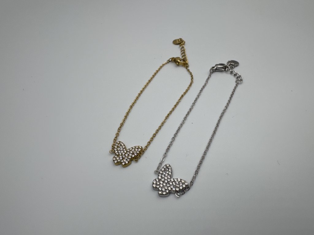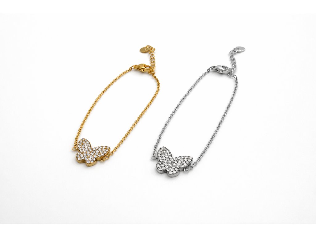 Tento dámský náramek s motivem motýla zaujme svým jemným a elegantním provedením. Přívěsek motýla je bohatě zdoben drobnými kamínky, které dodávají šperku výrazný, ale stále decentní lesk. Motýl symbolizuje svobodu, proměnu, lehkost a nový začátek.