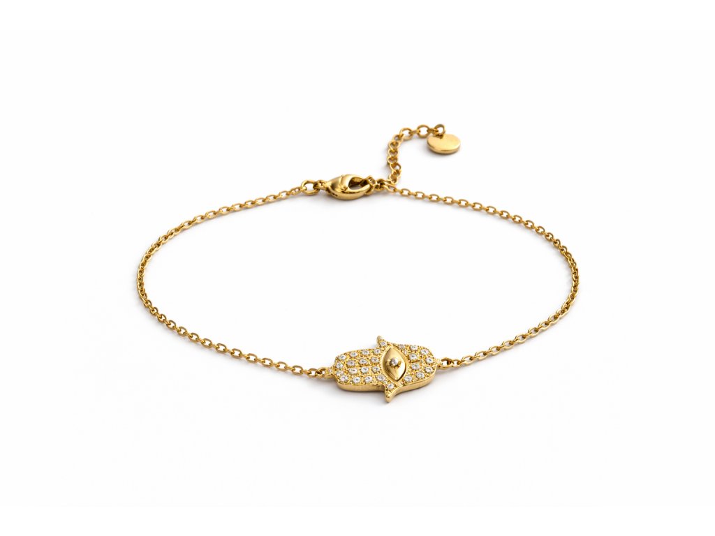 Tento dámský náramek s motivem Ruky Fatimy (Hamsa) je tradičním symbolem ochrany, harmonie a pozitivní energie. Precizně zpracovaný motiv je zdoben jemnými kamínky, které dodávají šperku luxusní a elegantní vzhled, aniž by působil přehnaně výrazně.