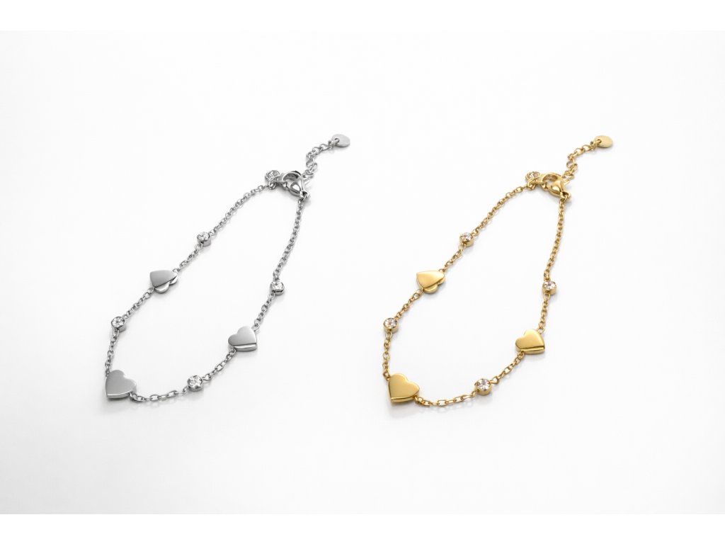 Tento dámský náramek s motivy srdíček je ztělesněním jemnosti, romantiky a nadčasového stylu. Hladká srdíčka jsou rovnoměrně rozmístěna po řetízku a doplněna drobnými kamínky, které dodávají šperku decentní třpyt a elegantní vzhled.