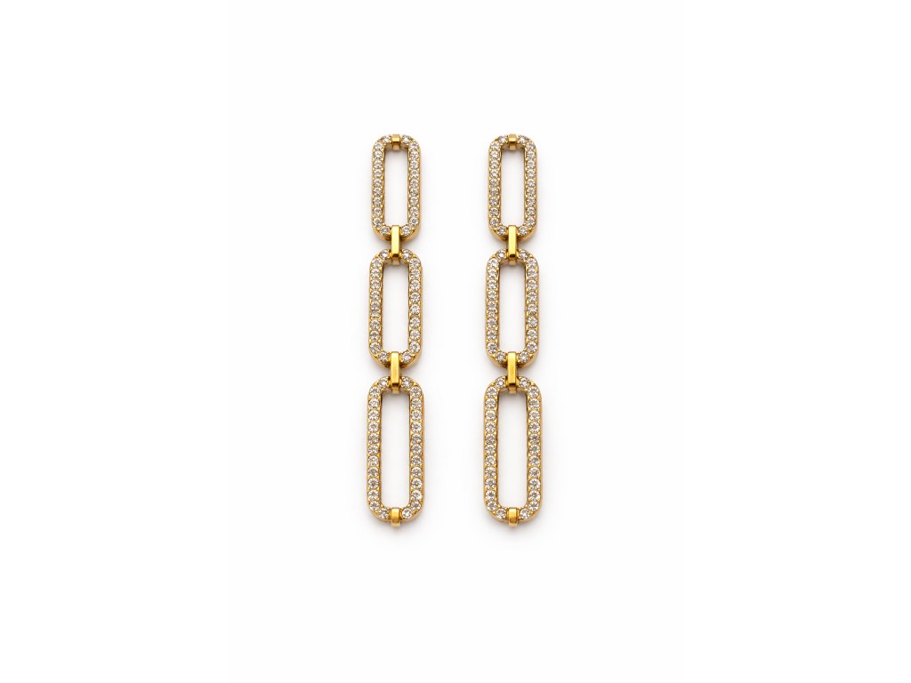 Tyto dlouhé náušnice jsou složeny z několika vzájemně propojených pravokutno-oválných karik, které jsou po obvodu osazeny drobnými třpytivými kamínky. Díky své délce krásně prodlužují krk a při pohybu působí velmi efektně.