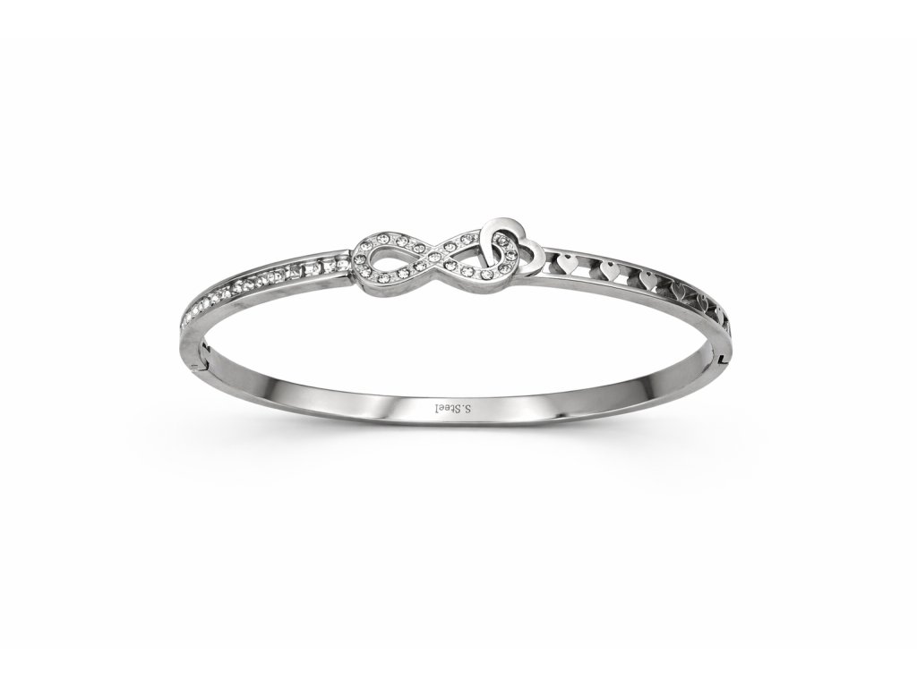 Tento elegantní pevný náramek je vyroben z kvalitní nerezové oceli a zaujme svým jemným dekorativním motivem, který je doplněn decentně vsazenými kamínky. Design působí harmonicky, ženským dojmem a není přehnaný.