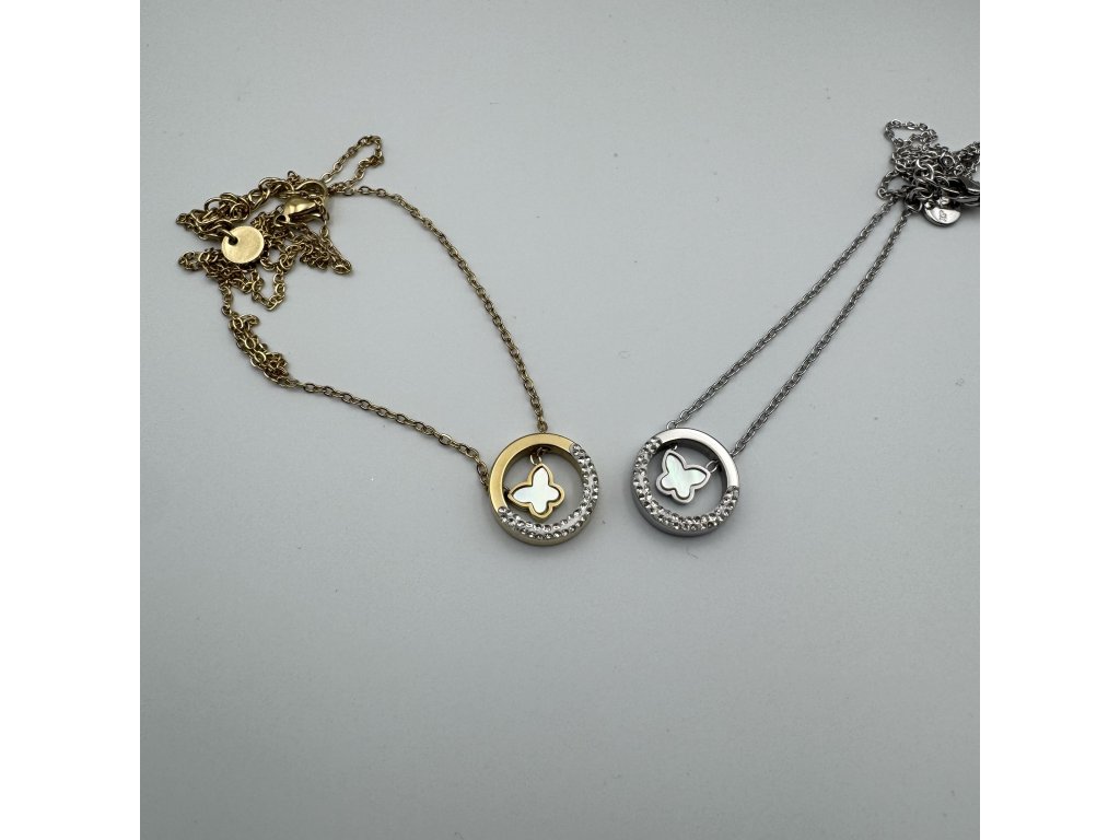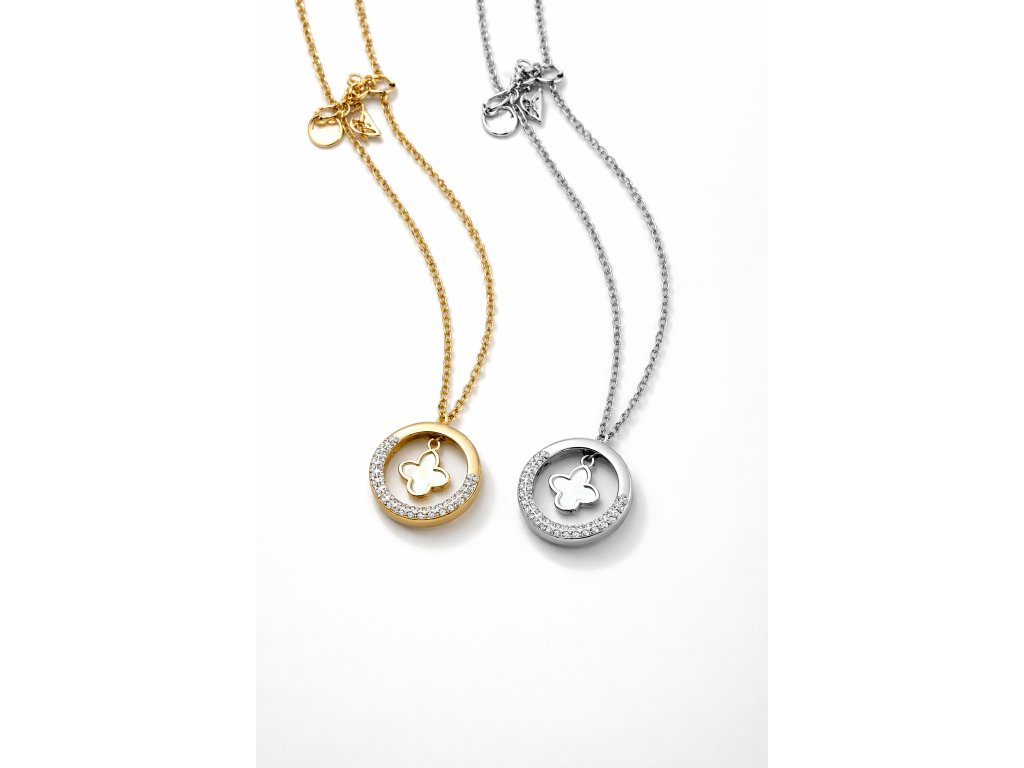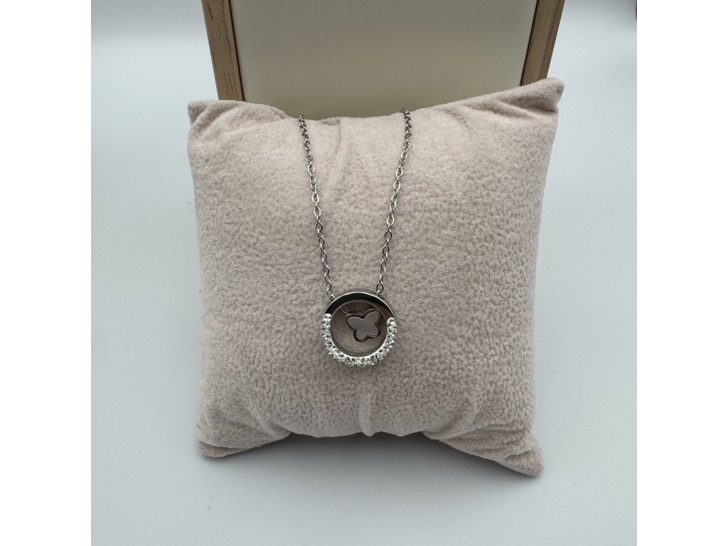 Tento elegantní náhrdelník spojuje čistý kruhový design s jemným symbolem motýlka, který představuje lehkost, proměnu a ženskost. Motýlek je umístěn uvnitř kruhu zdobeného třpytivými kamínky, které dodávají šperku decentní luxusní vzhled.