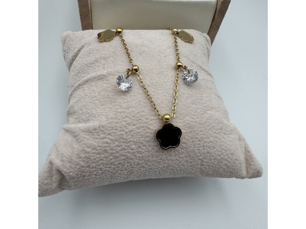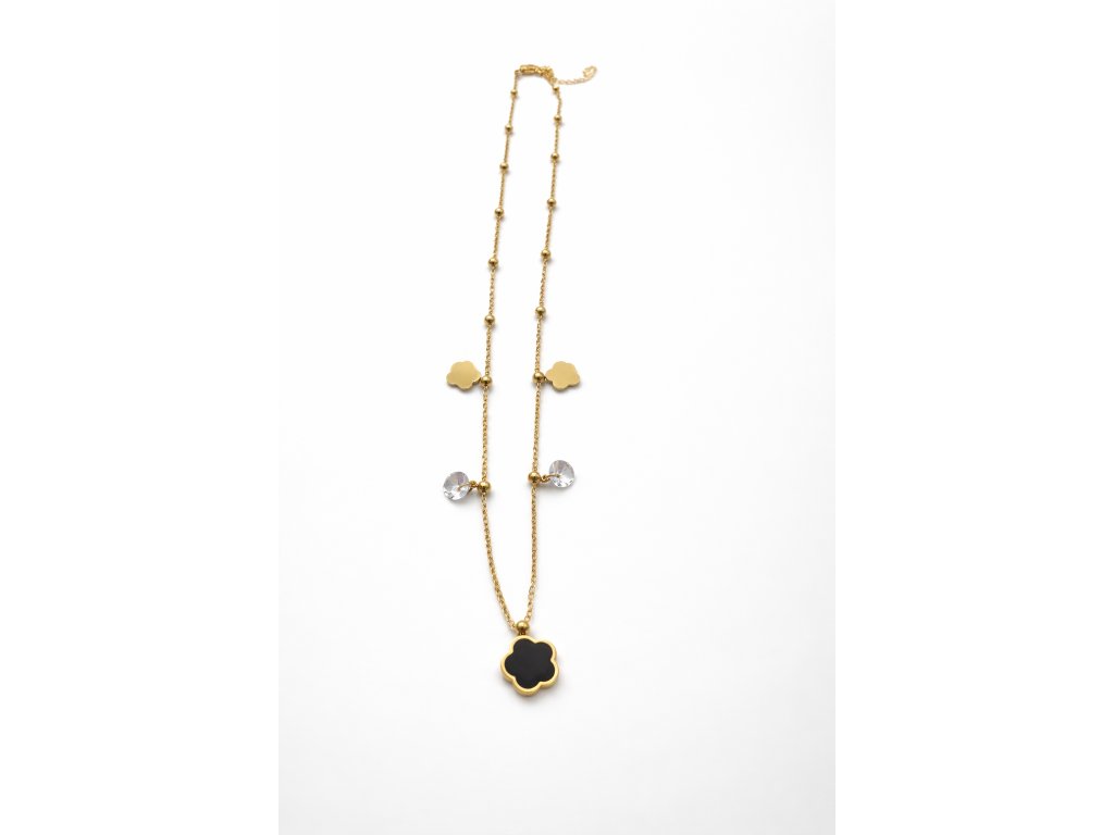 Tento elegantní náhrdelník s motivem květu zaujme čistým designem a harmonickou kombinací jemných detailů. Černý středový prvek vytváří krásný kontrast se zlatým tónem řetízku, zatímco drobné krystaly dodávají šperku decentní třpyt.
