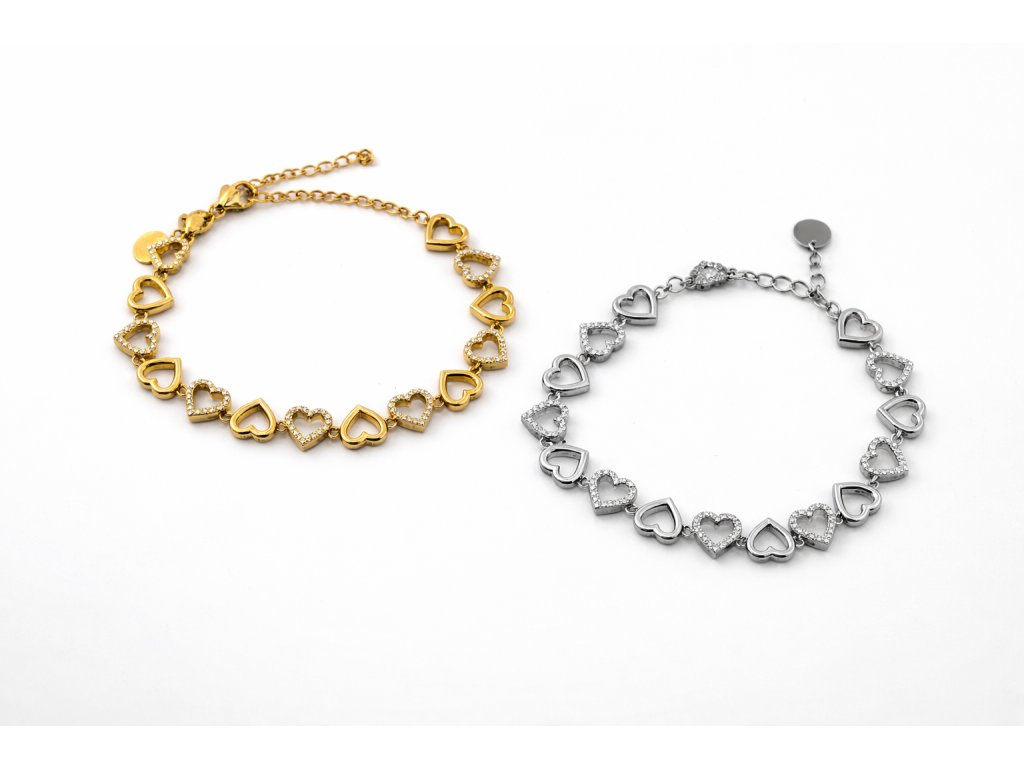 Tento elegantní náramek se srdíčky je dokonalým symbolem lásky, něhy a ženské elegance. Pravidelně rozmístěná srdíčka vytvářejí harmonický celek, který působí jemně, ale zároveň velmi vkusně. Vybrané prvky jsou doplněny třpytivými detaily, které krásně odrážejí světlo a dodávají šperku luxusní nádech.
