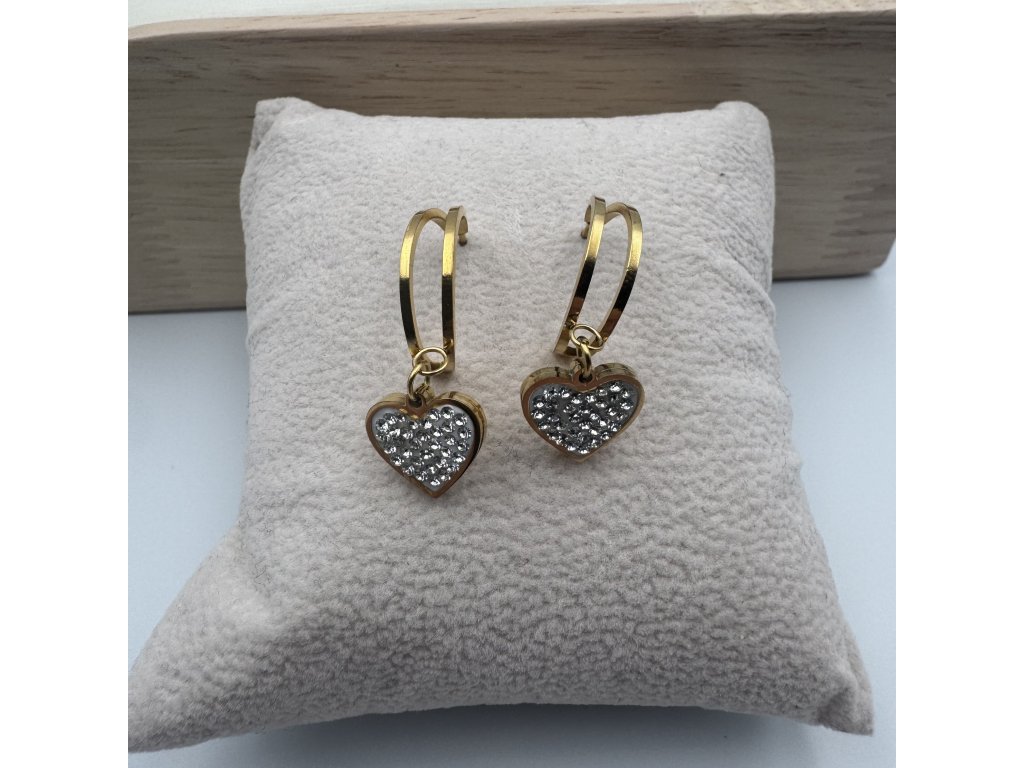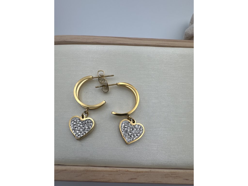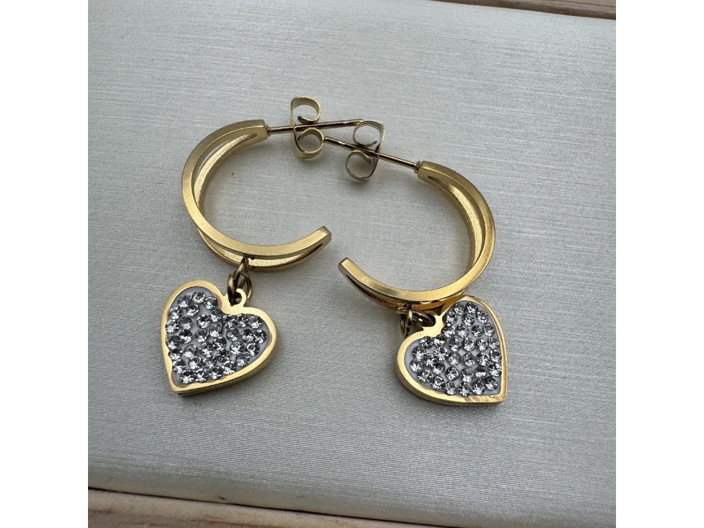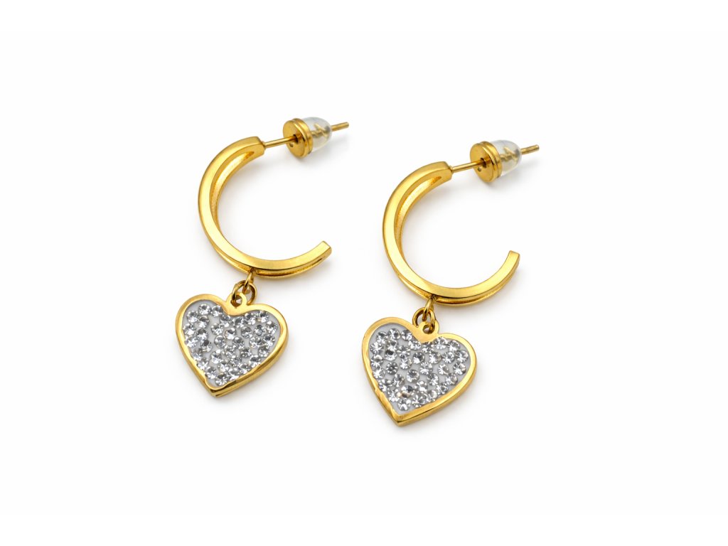 Tyto otevřené náušnice v moderním C-tvaru působí lehce, elegantně a současně velmi žensky. Závěsné srdce osazené drobnými třpytivými kamínky dodává šperku jemný lesk a pohyb, který krásně vynikne při nošení.
